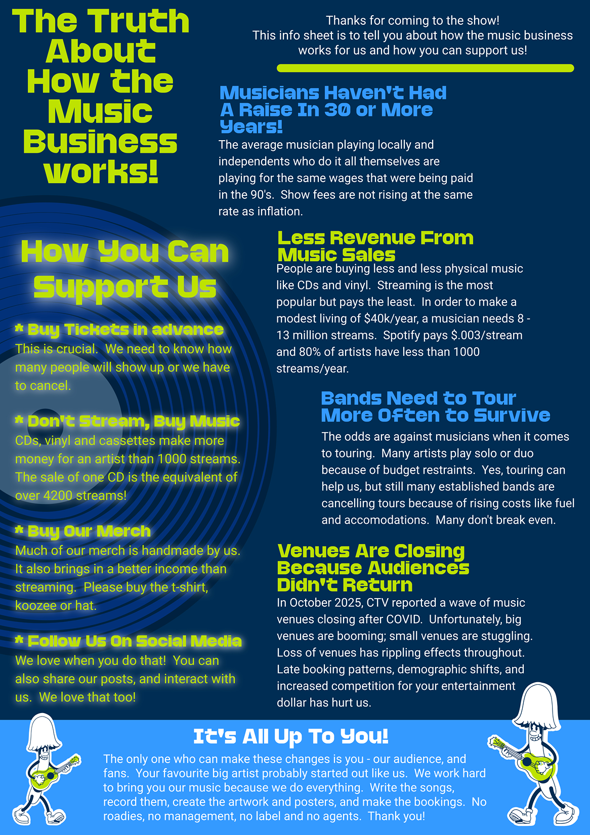 Most folks who enjoy our music don't know how the music business works. What they do know has been fed to them via movies and TV programs about musicians becoming successful. In the 21st century, that music business model is gone. Labels today expect the artist to have almost fully developed careers before signing them. Most of us are not looking for fame. Almost all of us want is to make a decent living from our music. This infographic has some key points on it that will hopefully enlighten our patrons. It can't hurt, and maybe it will help. You can download the pdf at the link below.